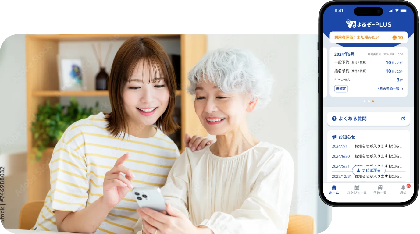 「よぶぞー(予約アプリ)」からの配車依頼をアプリ操作のみで受けることができます。予約時に乗降場所の指定や、必要な介護サービスが指定されますので、予約内容の食い違いが発生しません。