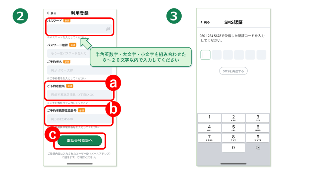 SMSの認証をいたしますので、SMSの受信が可能な電話番号を②a赤枠「ご予約者電話番号」にご入力ください。
