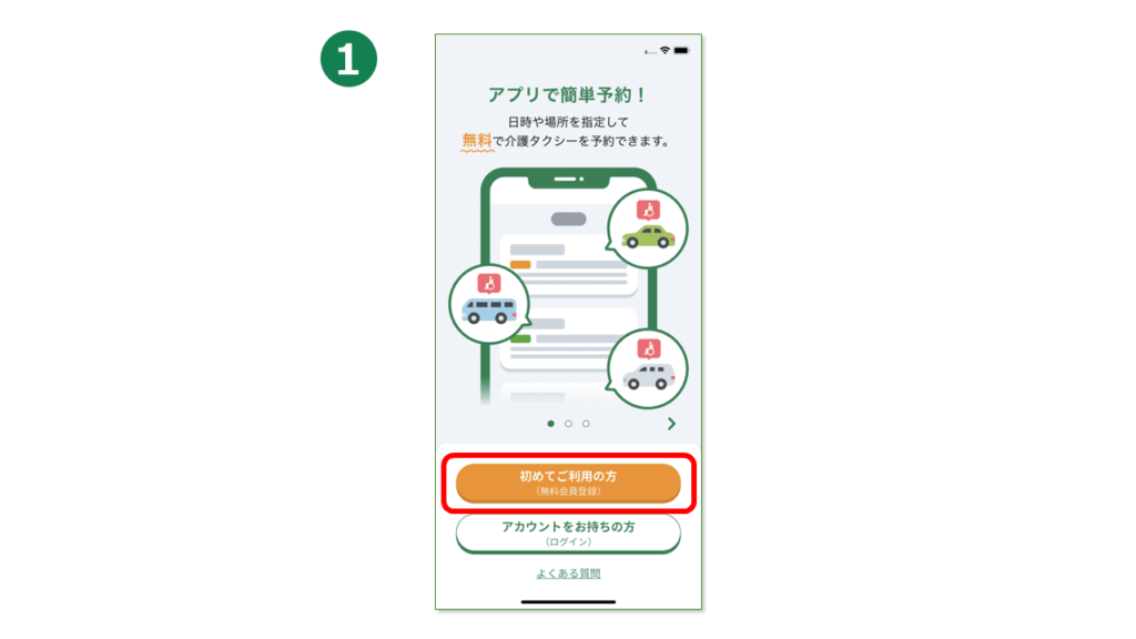 ご利用を開始するには①の赤枠「初めてご利用の方」をタップ