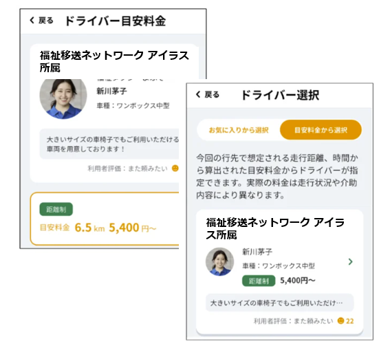 『よぶぞー』では、介護タクシーの予約時に対応可能なドライバーを一覧表示し、希望ドライバーの選択をすることができます。今回の協業により、アイラスの加盟事業者をひと目で判別できるように表記されます。